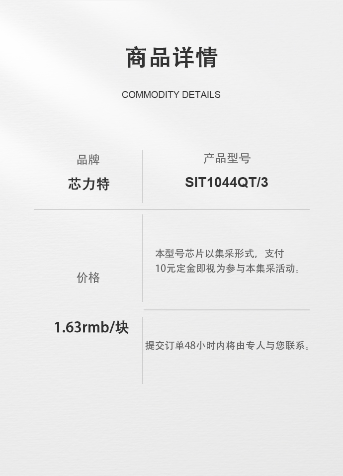 商品名称:SIT1044QT/3 集采定金 商品货号 : XDD000547 品牌 : 芯多多 产地 : -- 产品型号 : SIT1044QT/3 包装规格 : -- 等级 : -- 生产许可证号 : --